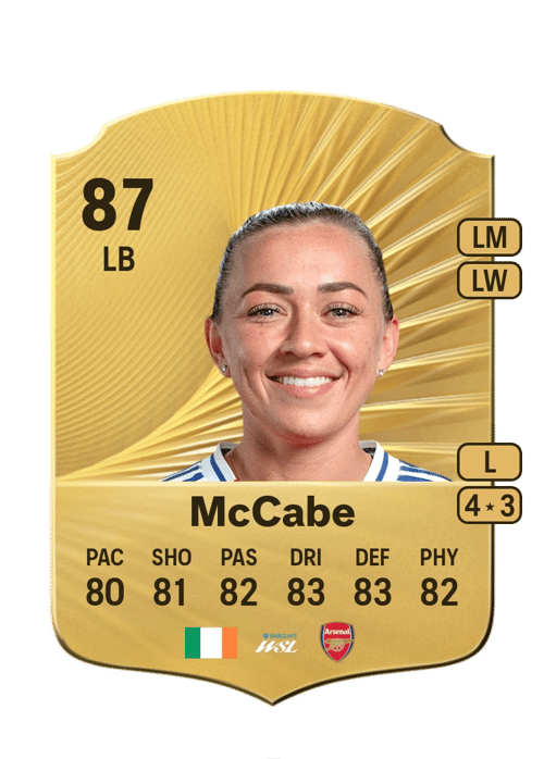 Noté 87 GEN, cette carte Rare de Katie McCabe offre une vitesse solide (80 VIT) et un dribble fiable (83 DRI). Les 4★ gestes techniques débloquent des actions créatives,