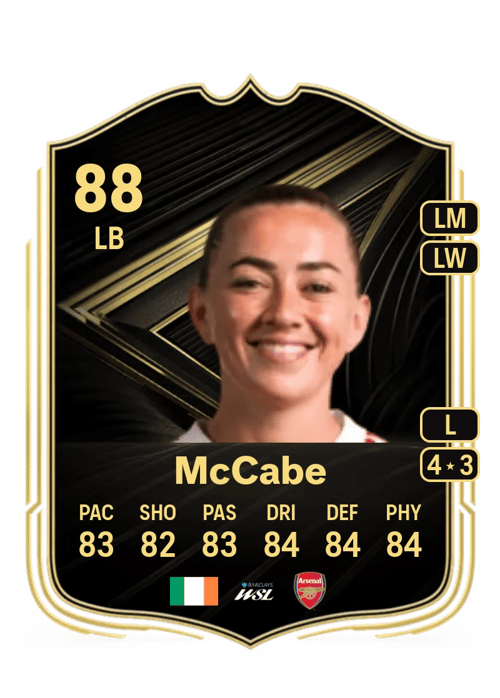 Sous cette forme Team of the Week, Katie McCabe démontre une vitesse solide (83 VIT) et un dribble fiable (84 DRI). Les 4★ gestes techniques débloquent des actions créatives, Cette version offre +1 GEN de plus que la carte de base notée 87.