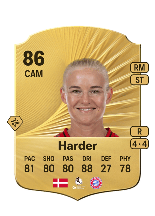 Sous cette forme Gold, Pernille Harder démontre une vitesse solide (81 VIT) et un dribble d'élite (88 DRI). Les 4★ gestes techniques débloquent des actions créatives, tandis que 4★ pied faible assure la régularité des deux pieds.